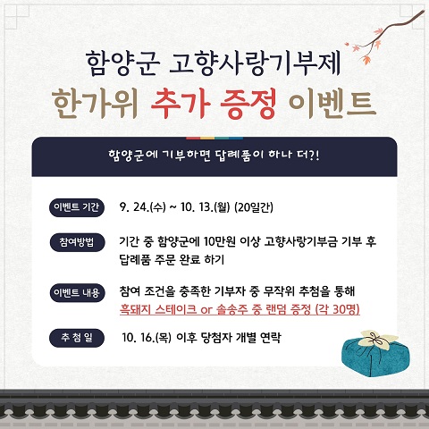 [¼¿ïÆ÷½ºÆ® À̰¿õ ±âÀÚ=] ÇԾ籺Àº ¿À´Â 10¿ù 13ÀϱîÁö Áö¿ª°æÁ¦ Ȱ¼ºÈ¸¦ À§ÇØ Ãß¼® ¸íÀý¸ÂÀÌ °íÇâ»ç¶û±âºÎÁ¦ ´ä·Êǰ Ãß°¡ ÁõÁ¤ À̺¥Æ®¸¦ ½Ç½ÃÇÑ´Ù°í ¹àÇû´Ù.