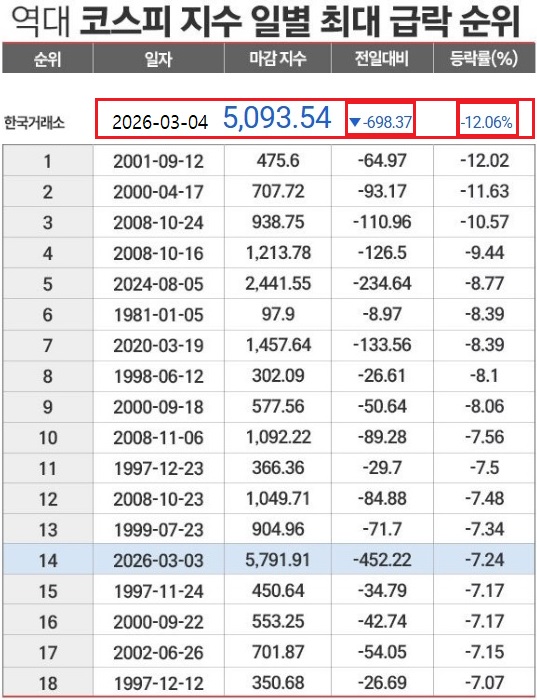 [¼¿ïÆ÷½ºÆ® ÀÓÀçÈ£ ±âÀÚ=] ÀÌÀç¸í Á¤ºÎ µé¾î ¹ÌÃļ ¿À¸¥ ÄÚ½ºÇǰ¡ 2¿ù 26ÀÏ¿¡´Â ¿ª´ë ÃÖ°íÄ¡¸¦ ±â·ÏÇÏ´õ´Ï, 3¿ù 4ÀÏ¿¡´Â ±× Ç϶ôÆø°ú Ç϶ôÀ²ÀÌ ¿ª´ëÄ¡ ±â·ÏÀ» °¥¾Æ Ä¡¿ü´Ù. ÀÌÀü ±â·ÏÀº 2001³â 9.11 ¹Ì±¹ ¹«¿ª¼¾ÅÍ Å×·¯ ¶§ÀÇ 12.02% Ç϶ôÀÌ´Ù.
