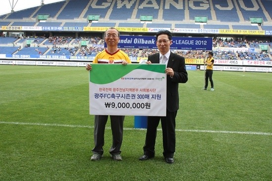 À̳¯ °æ±â½ÃÀÛ Àü ±¤ÁÖFC ½Ã¹ÎÇÁ·ÎÃ౸´Ü ½ÃÁð±Ç 300¸Å(900¸¸¿ø »ó´ç)¸¦ ÇÑÀü ±¤ÁÖÀü³²Áö¿ªº»ºÎ(º»ºÎÀå ÀÌÇüö)¿Í Á÷¿øµéÀÌ Á¶¼ºÇÑ ·¯ºêÆÝµå·Î ±¸¸ÅÇÏ¿© ¾î¸°ÀÌÀç´Ü ¡®ÃÊ·Ï¿ì»ê¡¯ ±¤ÁÖÁö¿ªº»ºÎ¿¡ ½ÃÁð±Ç 300¸Å Àü´ÞÇÏ´Â ³×Àֵ̹¥ÀÌ Çà»ç¸¦ ÁøÇàÇß´Ù.